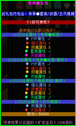 | ◆ 累计充值【1500】RMB: 传承武器100%进阶旷世宝石 *2 | ||